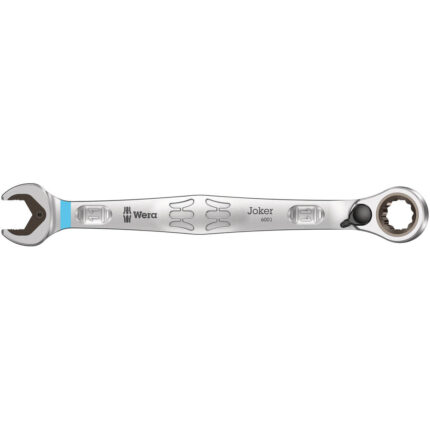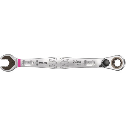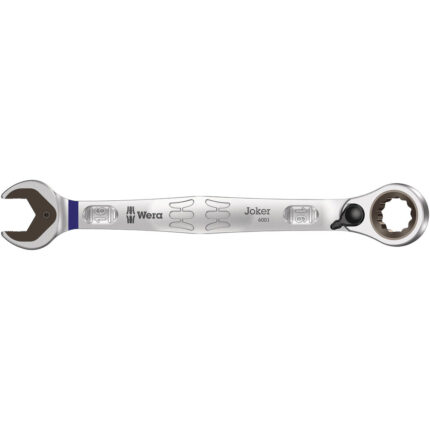 Por el hecho de que en los trabajos de uniones atornilladas los espacios de montaje son cada vez más estrechos es necesario que los usuarios dispongan de herramientas con las cuales también puedan trabajar de forma exitosa en estas situaciones. En entornos estrechos se necesitan puntos adicionales en los cuales se pueda reposicionar la herramienta. ¿Entonces, será posible modificar las llaves de boca de tal manera que aumenten las posibilidades de reposicionamiento de la herramienta? Por medio de la combinación de la boca que se encuentra girada en un ángulo de 7,5° y la geometría del doble hexágono, se logra una duplicación de los puntos de posicionamiento de la herramienta al atornillar. Al girar la llave de forma repetida en 180° por su eje longitudinal durante la acción de atornillar se dan cuatro posibilidades, y así las tuercas y los tornillos pueden accionarse cada 15°. De esta forma, la Joker 6003 con su geometría de boca tan ingeniosa amplía el espectro de aplicaciones en espacios estrechos de una manera importante. La Joker 6003 prácticamente encuentra el punto correspondiente de posicionamiento autónomamente después de cada giro de la herramienta. El lado anular es delgado pero sin embargo muy robusto y se encuentra doblado en un ángulo de 15° con relación al eje del útil. El acabado de la superficie de alta calidad garantiza una protección anticorrosiva efectiva y duradera. Lleva el sistema de búsqueda de la herramienta «Take it easy»: con marcas a color según el tamaño. Los bolsos de la Joker llevan un sistema de adherencia autoadhesiva en su lado posterior para que se puedan depositar de forma fácil en la pared, la estantería o el carro de las herramientas en el taller, o para conectarlas con el sistema de transporte Wera 2go.