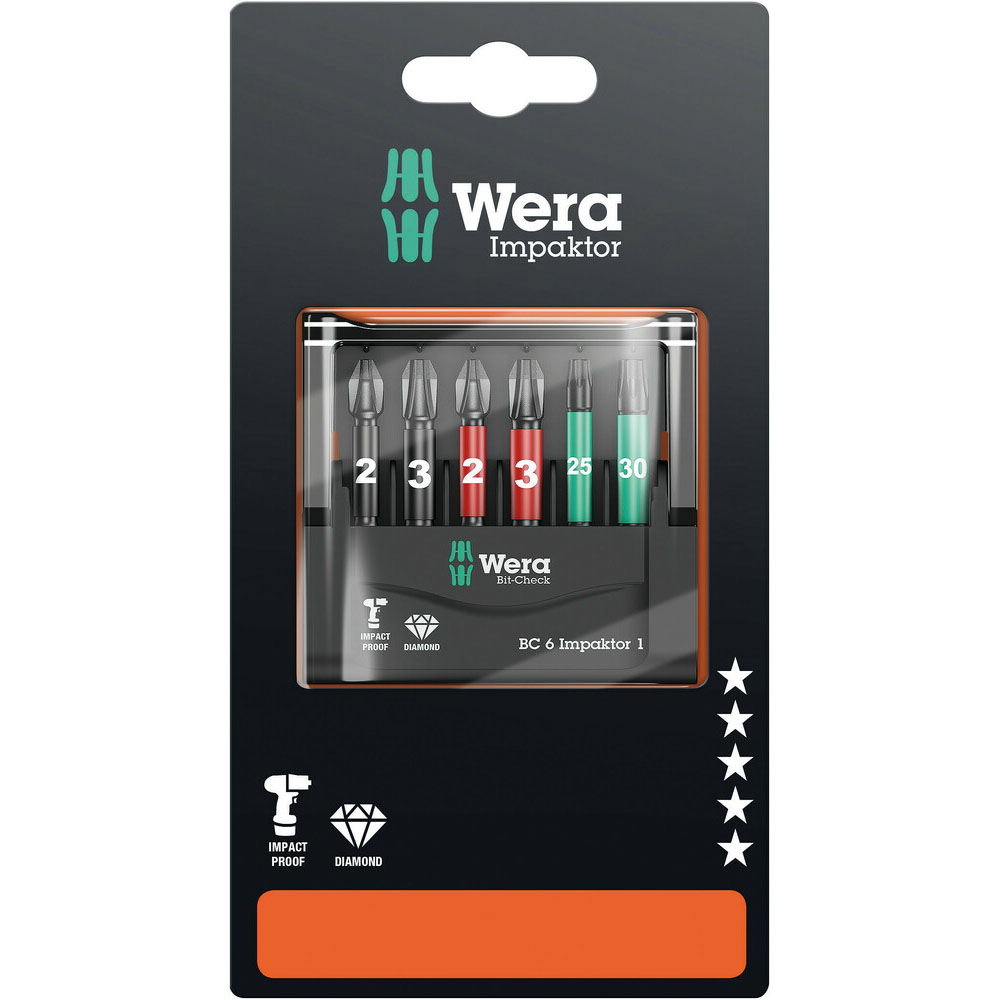 6 puntas Impaktor de Wera de un largo de 50 mm alojadas de forma sistemática en un espacio mínimo en un Bit-Check práctico. Por medio de un aprovechamiento óptimo de las características del material, así como con ayuda de una geometría óptimamente adaptada, la tecnología «Impaktor» proporciona vidas de servicio sobreproporcionales de la herramienta, incluso en el caso de que se den cargas extremamente altas. Las puntas llevan unas partículas diminutas de diamante en el extremo de la punta que, gracias al aumento de la resistencia friccional que de ahí resulta, reducen el riesgo de que la punta se salga del tornillo por resbalamiento.