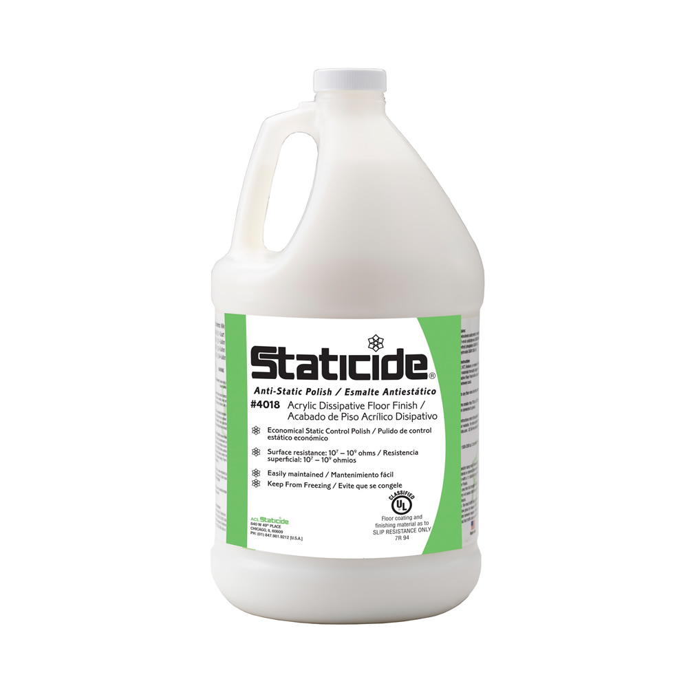 Staticide® 4018 Acrylic Floor Polish offers static protection at an economical price. This low-cost formula leaves a durable, glossy finish that can last up to six months with proper maintenance, making it a popular choice for companies with industrial areas where frequent cleaning is necessary. Suitable for production areas, warehousing, shipping, laboratories, and electronic repair facilities.